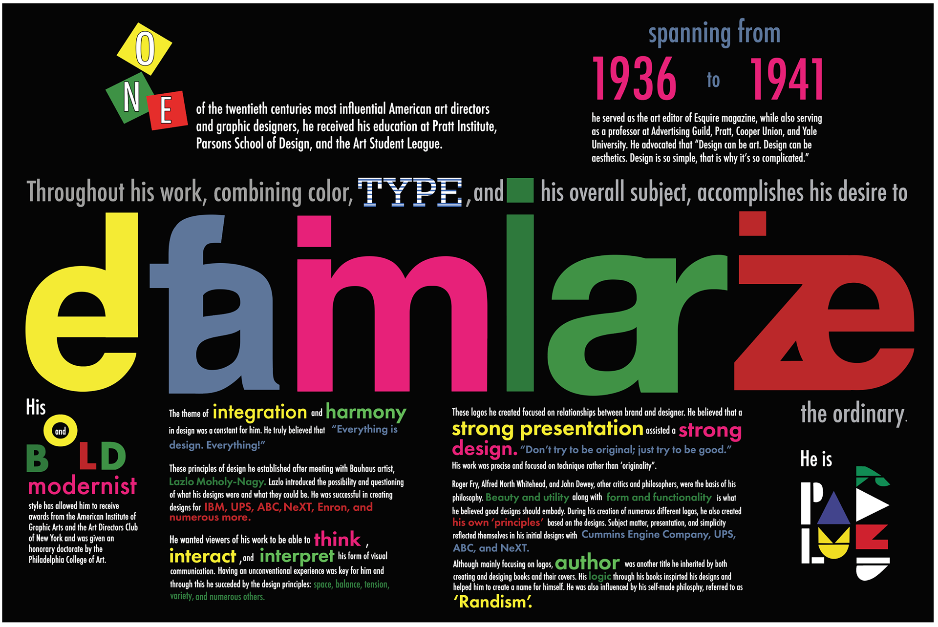 “Who Is Paul Rand?” highlights Paul Rand’s influence as a graphic designer by exploring his use of bold color, typography, and modernist principles. Through layered imagery and dynamic type, the composition reflects his belief in simplicity, clarity, and strong visual communication. Inspired by his work, it emphasizes contrast, hierarchy, and playful color while demonstrating how thoughtful design can transform meaning and effectively communicate ideas.